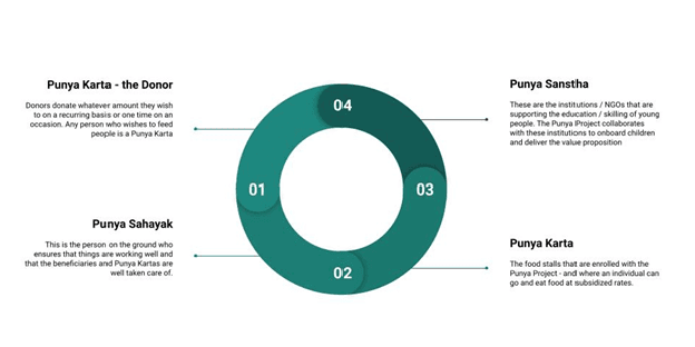 The Punya Project works by bridging the gap between ‘Punya Kartas’, Punya ‘Sahayaks’, ‘Punya Datas’ and Beneficiaries, creating a network that ensures food availability for the needy. We tie up with institutions where education and skills are being imparted and ensure that children / young adults get educated and trained there. In lieu of this action - they get assured food from providers of their choice in their vicinity.